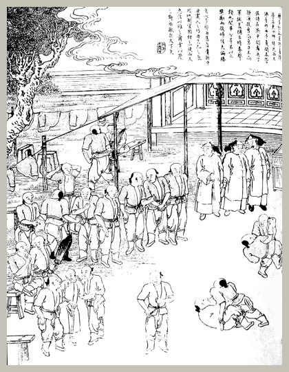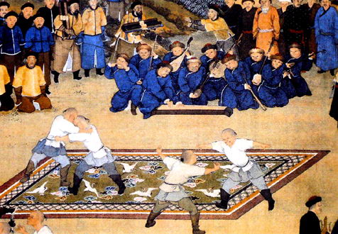 三是宫中的摔跤比赛。清代宫中规定,王公大臣和御前待卫在上朝时都不准带兵器,若万一发生不测,就需要御前待卫徒手解决问题,这就要求他们有很高的摔跤本领。据史载,清康熙帝年幼即位,朝中大权掌握在权臣鳌拜手里。鳌拜力大无穷,擅长摔跤,加上功勋盖世,因此不把康熙放在眼里。康熙为了除掉鳌拜,就组织宫中太监练习摔跤并趁一次鳌拜单独朝见时把他摔倒后杀死。之后康熙帝便在宫中组织了专门的摔跤队伍——善扑营,人数达300人,并按他们的技艺高下分成三等,按等级领取饷银。这些善扑营的成员除了进行摔跤比赛和表演,平时整天在宫中切磋摔跤技艺,对摔跤运动的发展起到了重要作用。