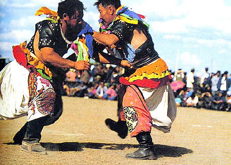 二是满族与蒙古族间的摔跤比赛。满族和蒙古族一直保持着良好的关系,早在皇太极进军中原前,为了取得蒙古贵族的支持便经常与他们聚宴,而摔跤是聚宴中不可或缺的助兴活动。满人入主中原后,仍一直保持着与蒙古贵族的聚宴和摔跤活动,并规定每年举行一次,成为制度。据《清稗类钞》记载,顺治帝时,蒙古使臣喀尔喀来朝,在双方的宴会中,照例进行了满蒙摔跤手的摔跤比赛。结果,满族的摔跤手纷纷败在蒙古族摔跤手的手下。顺治帝很生气,可是也无可奈何。这时陪宴的礼亲王代善的一个儿子打扮成摔跤手的样子与蒙古族摔跤手比赛,最后大获全胜。顺治帝高兴万分,厚赏了代善的儿子。