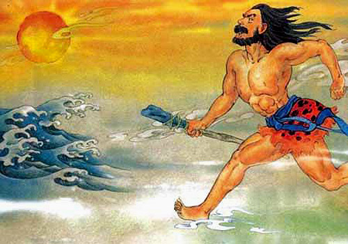 有一年,天大旱。火一样的太阳烤焦了地上的庄稼,晒干了河里的流水。人们热得难受,实在无法生活。夸父见到这种情景,就立下雄心壮志,发誓要把太阳捉住,让它听从人们的吩咐,更好地为大家服务。