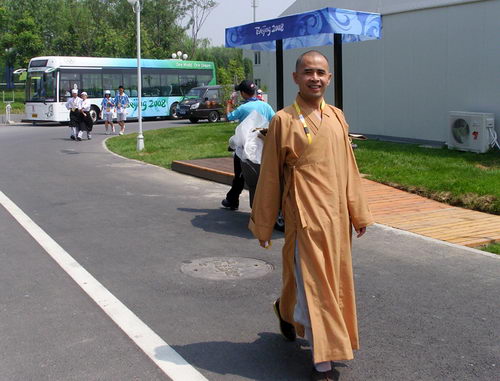 在奥运村的宗教中心,北京宗教局的领导担任服务中心的经理、副经理和办公室管理人员等,我们(法师们自称)就是服务人员。7月3号上午,经理召集各大宗教的志愿者开会,交代上午的工作——洒扫庭院,以待贵宾,因为下午将有约两千名测试人员进入奥运村各个服务机构进行测试。
