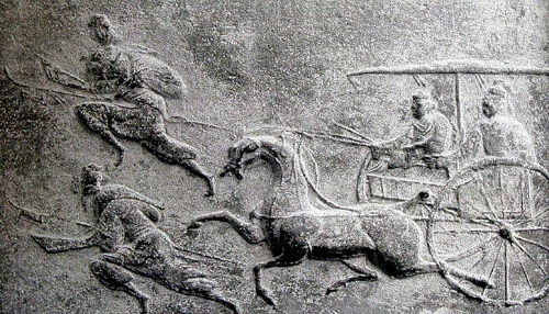 东汉时期(25--220年)的轺车画像砖,左侧是两们正在奔跑的“马前走”