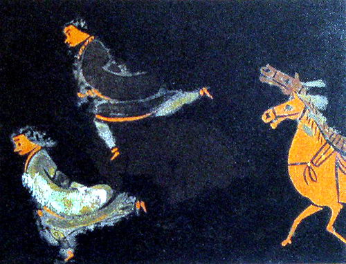 战国时期的彩绘车马人物,图中正在马前奔跑的是两位侍从人员