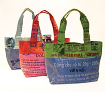 想想全世界挨饿的孩子们吧。因为你买了这个叫做Gecko Trader MarketBag的购物袋,他们中就有人能吃到大米。这些包的原材料是越南人的米袋。它们被收集起来,带到柬埔寨进行清洁和加工,比一般的纸袋和塑料袋牢固。每个袋子都有少许不同:有的文字多些,有的图案多些,还有的磨损得更厉害。它们都是在经公平贸易组织认可的小村庄里制造的。
