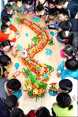 在我的老家山西运城,每当逢年过节或是喜庆日子,家家都有蒸花馍的习俗。今年春节我放假回家,看见妈妈忙着蒸制精美的大花馍,突然想起前一天晚上梦见清晨的天空有条巨龙在舞动,当即萌生了全家制作一条面塑巨龙来庆贺2008奥运年的灵感。我的想法立即得到了全家人的支持,于是利用春节假期大家动手,齐心合力,四处寻找材料,配制各种色彩,拿出家里最好的雪花粉,开始行动。