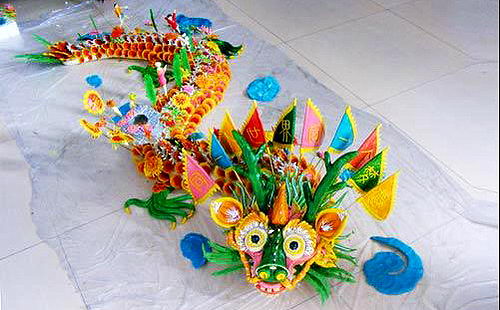 面塑巨龙的制作真是一波三折,首先龙体蒸出后没几天,面的表面就出现了裂口,下面还长出了绿毛,捏出的福娃、鸟巢、花草等都一触即碎。爸爸多次上网查资料,最后在面粉里加上糯米粉,食盐,甘油等配料,经过反复的试验,终于解决了馍皮裂口问题,并能长时间存放。如何蒸出5.6米长的龙体也是大难题,经过多次试验我们决定分节蒸,并在面粉里加了千分之一的山梨酸钾,分两次蒸,龙体出锅后按照每段的造型顺序用竹签连接在一起,龙身就做好了。然后把要插的花按疏密,分层次,合理布局,用长短不一的竹签先插龙身底层的鳞片,再插稍高一点的花草鱼虫,然后是福娃、鸟巢、运动员,最后一层是红底黄边的“北京欢迎你”和“迎奥运”字牌。最后在整个巨龙周围放置好29朵云彩,用以衬托巨龙腾云驾雾,高空翱翔!