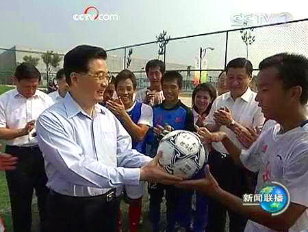 胡锦涛在足球上写下“自强不息 奋勇争先”8个字激励残疾人运动员。