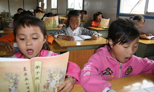 5.12汶川地震发生后,仁爱慈善基金会在绵竹灾区建立第一个学堂。学生们正在朗读“弟子规”。