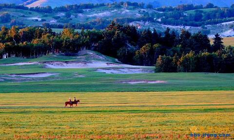 碧绿的草原苍茫辽阔,一望无际,朵朵白云像崭新的棉絮般静静地浮动着,在蓝天映衬下,越发显得皎洁。羊群如同碧海中流动的云彩,马群好似绿浪中奔腾的浪花,乳白色的蒙古包群像是撒落在绿色翡翠盘里的珍珠。天地相连,浑然一体,构成了异常瑰丽的画卷。夕阳西下,远山披上了晚霞的彩衣裳,牛羊背上如同镀上了一层金,天边的云朵也变得火焰一般鲜红。