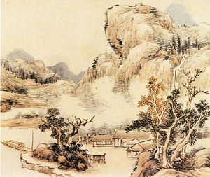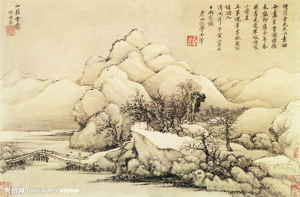 (二)中国画不注重透视法,西洋画极注重透视法。透视法,就是在平面上表现立体物。西洋画力求肖似真物,故非常讲究透视法。试看西洋画中的市街、房屋、家具、器物等,形体都很正确,竟同真物一样。若是描走廊的光景,竟可在数寸的地方表出数丈的距离来。若是描正面的(站在铁路中央眺望的)铁路,竟可在数寸的地方表出数里的距离来。中国画就不然,不欢喜画市街、房屋、家具、器物等立体相很显著的东西,而欢喜写云、山、树、瀑布等远望如天然平面物的东西。偶然描房屋器物,亦不讲究透视法,而任意表现。例如画庭院深深的光景,则曲廊洞房,尽行表示,好似飞到半空中时所望见的;且又不是一时间所见,却是飞来飞去,飞上飞下,几次所看见的。故中国画的手卷,山水连绵数丈,好像是火车中所见的。中国画的立幅,山水重重叠叠,好像是飞机中所看见的。因为中国人作画同作诗一样,想到哪里,画到哪里,不能受透视法的拘束。所以中国画中有时透视法会弄错。但这弄错并无大碍。我们不可用西洋画的法则来批评中国画。