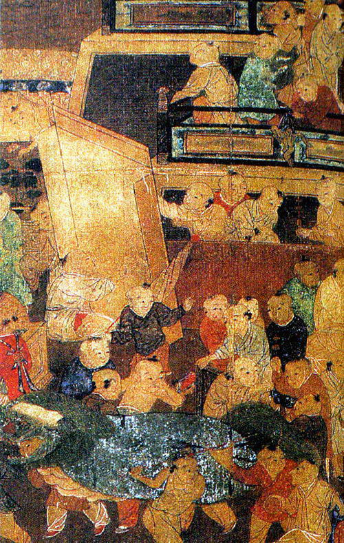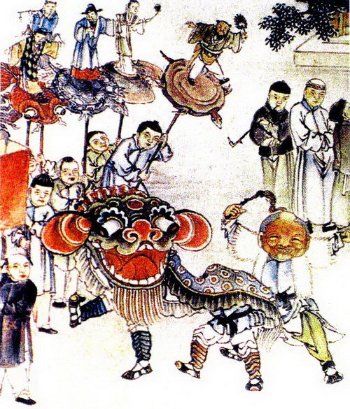 宋人苏汉臣绘制的《百子嬉春图》(局部),下方为儿童举行舞狮表演的情形