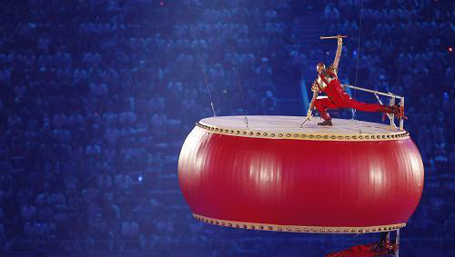 中国元素在文艺表演中占据了重要的地位。第一节中,身着以祥云纹底衬的服装,头上、手上、衣服上系满了银铃的苗族少女从四个方向涌向中心场地,“哗哗哗” 清脆的银铃声响彻全场、沁人心脾。中心舞台上是一个鼓阵,两面天鼓从空而降,与地面上的鼓阵和银铃相呼应。“同心圆”形方队的不断变化组合展示世界人民真诚友谊。少林寺武校的少林小子脚踏飞轮,随着音乐在舞台上流淌,这里面融入了中国杂技元素的演出。中国元素组合,神奇梦幻、五彩缤纷的方队表演把现场的欢乐和激情点燃。