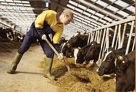 为让奶牛的产奶量达到最大限,业者饲以高热量的饲料,如大豆、鱼粉、酿酒副产品,甚至于鸡粪。牛的特殊消化器官是不适应这类食品的。反刍的系统是为了消化发酵的草。生下小牛之后几个星期,母牛的产奶量达到最高,这段时期,母牛支出的比它能够吸取的还多。由于它产奶的能力超过了吸取食物的能力,因此开始分解取用自己身体的组织;它开始“舍身产奶”。