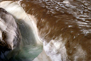 近距离聆听,乌鲁木齐天山一号冰川上全球变暖的声音简洁而有力:滴嗒!滴嗒!滴嗒!在距主冰壁30米处,冰雪融水的洪流日渐强大,在灰冰层下凿出一条河流隧道,只在表面留下一层只看得见泡泡的、极薄的冰面。
