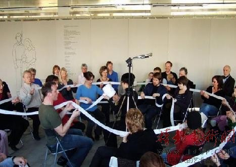 一条长长的导带将观众群分割为螺旋形,观众在未经告知游戏规则的状况下,随着前人的示范,由内圈向外,自左而右地传送着带子,观众们各随其意地或诵或唱出其上不具意义之字母或音节组合。在众人重迭反复的朗读下,形成了轰轰然的音团:此一音团由弱而强,缓慢、有机、不间断地持续发展着。