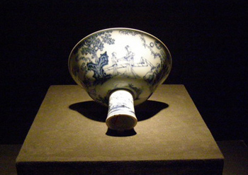 青花瑶台赏月图瓷锺。出自梁庄王墓后室南部,