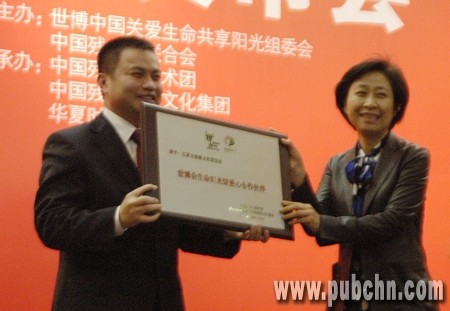 太阳雨太阳能营销总经理陈荣华(左)接受“世博会生命阳光馆爱心合作伙伴”牌匾。