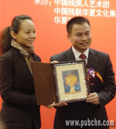 生命阳光馆爱心大使、中国残疾人艺术团团长邰丽华(左)向太阳雨太阳能营销总经理陈荣华(右)赠送“千手观音”金画。