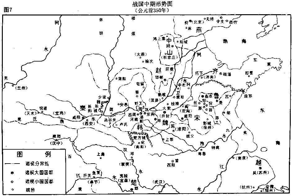 从以上情况可见,周边地区邦国部族对中国政局的影响是相当淡薄的,而“战国”地区的七雄,则在各股社会势力当中占据支配地位,它们相互间的战争对当时历史的发展起着决定性的作用;下面就对这一地区的政治力量分布态势进行分析。