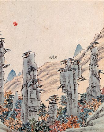 髡残性直硬,脾气倔强,寡交游,难于与人相合。这种强烈的个性表现在他的禅学上是“自证自悟,如狮子独行,不求伴侣”;表现在绘画上则为“一空依傍,独张赵帜,可谓六法中豪杰”。他自己也说:“拙画虽不及古人,亦不必古人可也。”他长期生活在山林泽薮之间,侣烟霞而友泉石,踯躅峰巅,留连崖畔,以自然净化无垢之美,对比人生坎坷、市俗机巧,从中感悟禅机画趣。髡残作品中的题跋诗歌多作佛家语,这不仅因其身为和尚,而且在他看来,禅机画趣同是一理,无处不通。如《禅机画趣图》轴、《物外田园图》册的诸多题跋,大都是借画谈禅,因禅说画。融禅机与画理于一炉,是髡残画作的主要特点之一。