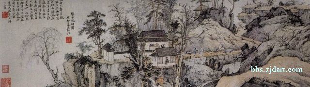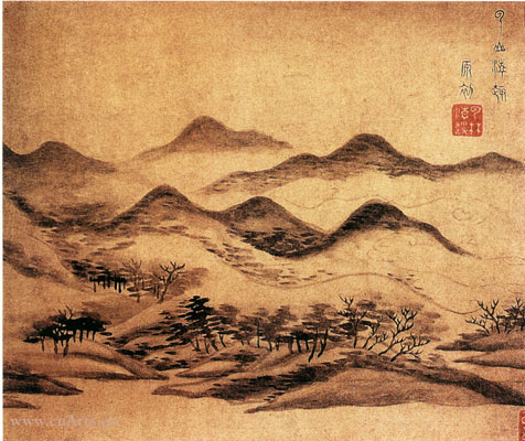 在“四僧”中,只有弘仁于出家之前有画迹可寻。他最早的作品有明崇祯七年(1634)创作的《秋山幽居图》扇和明崇祯十二年(1639)创作的《冈陵图》卷,署款均为“江韬”。《冈陵图》共由5位新安画家创作,各自独立成幅。弘仁之作笔法结构参用倪瓒、黄公望,秀逸可爱。其时,弘仁于5人中年龄最小,只有30岁,由于他画得过分认真,运笔略显拘谨文弱。