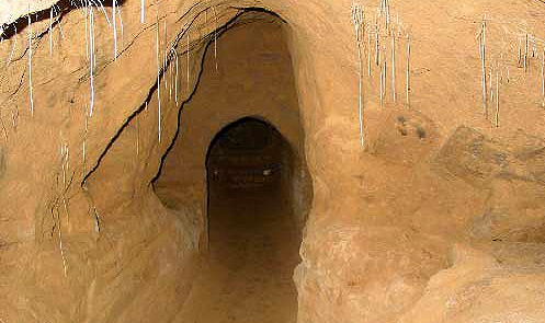 “藏兵洞”位于瓦屋辛庄村古地道群中心位置。它虽然不像“迷魂洞”那样扑朔迷离,但也经常变幻方向,此洞距地表1.7米左右,有3层向西的台阶,下台阶后向北拐进入一个南北走向的通道,通道中有5间并排的小屋,每间屋大约2平方米左右,可以藏人,通道和小屋都铺有地砖,每间小屋均分为两组,中间有一通道相隔,两组小屋与通道相接的开口方向相反,即使点烛相照,也不能一览无余,隐蔽性很强。更使人惊异的是,“藏兵洞”的一个出口竟然是在一口水井里面。