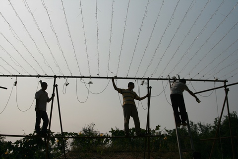 中秋节前夕,龙泉寺义工们连夜搭起钢管舞台,并亲自动手架设灯光。