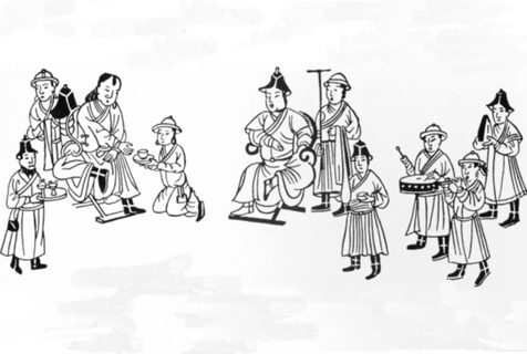 元代于延祐元年(1314)参酌古今蒙汉服制,对上下官民服色等作了统一规定。汉官服式仍多为唐式圆领衣和幞头。蒙古族官员则穿合领衣,戴四方瓦楞帽;中下层为便于马上驰骋,最时兴腰间多褶的辫线袄子(圆领紧袖袍,宽下摆、折褶、有辫线围腰)、戴笠子帽。