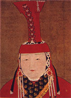戴故故冠、穿交领织金锦袍的元世祖皇后彻伯