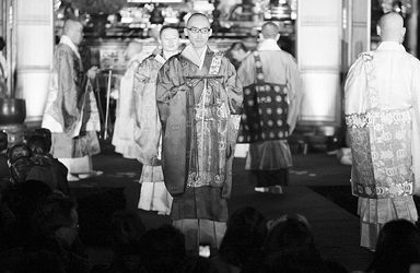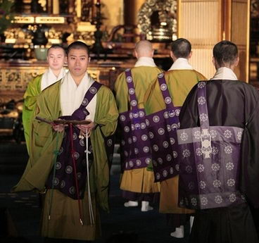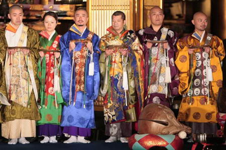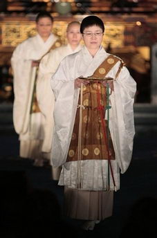 据美国媒体报道,当天在历史悠久的筑地本愿寺内,来自日本八大佛教宗派的约40名和尚和尼姑分批登场,伴随着快节奏的佛乐走起模特步,向观众展示精美华丽的各式僧侣服装。最后一批登台的5名来自不同宗派的僧侣口中高声诵读经文,“时装秀”最终在漫天莲花瓣形的五彩纸屑中结束了。
