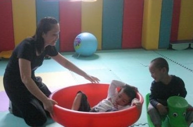雷艳芳老师(左一)在陪自闭孩子玩耍。吴黠摄