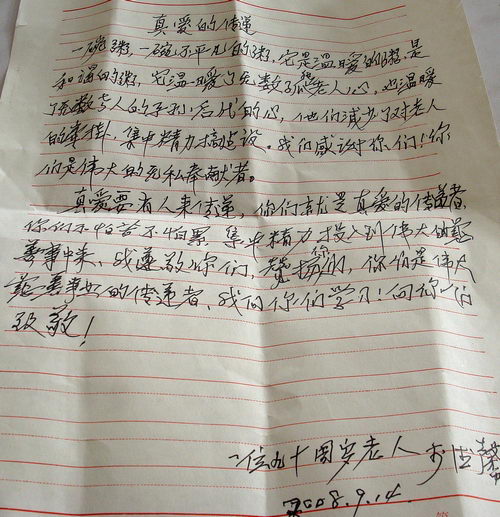 心栈里立刻响起热烈的掌声。陈老师感动地接过老人的信,义工们也都立刻围拢过来传看。只见字体清秀有力,老人家书写时的一番用心和满腔真情跃然纸上。