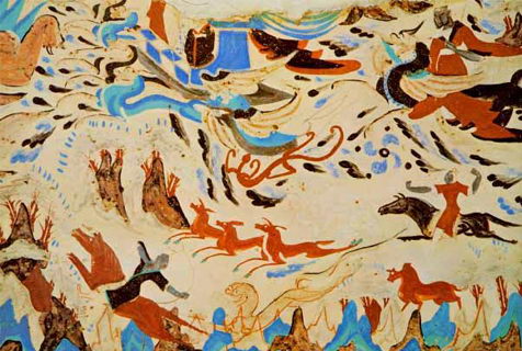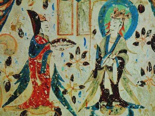 南北朝时期大量附丽在寺塔上的著名壁画,如张僧繇在江陵天皇寺所画卢舍那佛像和孔子十弟子像等,其画迹早已随同建筑物荡然无存。现在保存下来的仅有较为僻远之地的石窟壁画,如新疆拜城克孜尔石窟4~6世纪壁画、库车库木吐拉石窟5~6世纪壁画、甘肃敦煌莫高窟十六国、北魏、西魏、北周壁画、永靖炳灵寺石窟东晋十六国时西秦壁画、天水麦积山石窟北魏壁画等。其中属于这一时期的克孜尔石窟和库木吐拉石窟壁画,其风格具有龟兹文化特色和中亚佛教美术影响。属于这一时期的莫高窟36个洞窟的壁画,满布于各窟的四壁及窟顶、塔柱各处,除掉少量纯装饰性的题材外,主要题材包括具有情节性构图的佛传故事、佛本生故事、因缘故事,还有大量的菩萨、飞天、伎乐人、药叉等的形象。情节性构图的画幅中,艺术性最高的如第254窟《萨□那太子舍身饲虎》、第285窟《五百强盗成佛故事》、第257窟《鹿王本生》、第290窟《佛传故事》等,构思构图都极具艺术匠心。莫高窟早期佛教壁画,在中国汉代绘画传统的基础上接受了较为明显的印度、犍陀罗佛教美术的影响,显示了对外来画法的大胆吸收;而所画狩猎场景等,则又全然呈现出汉画趣味。在笔致、色调的运用上,北魏活泼厚重,西魏以后逐渐趋向文雅。