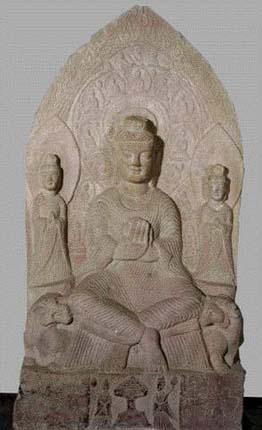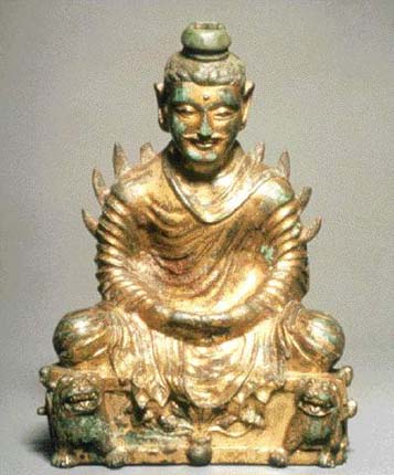 陆探微(生卒年岁不详),吴(今江苏苏州)人,活动时期是在刘宋文帝至明帝期间(公元四二四—四七一年),与云冈开窟时间(公元四六○年以後)约略相当。他对中国佛教绘画发展的主要贡献,是在更大程度上完成了由其师顾恺之开创的清癯秀朗佛教人物造型的风格化。张彦远说他笔下的人物“秀骨清像,似觉生动,令人懔懔若对神明”(《历代名画记》)。这其实是那个时代审美理想有代表性的人物造型,以长脸细颈、清瘦体型为特征,爽利的清癯身躯闪烁着聪慧智巧之光,体现出对婉雅俊逸超脱洒落的心理追求。陆作佛画,移书法的用笔于画法,笔迹劲利如锥刀。行笔紧细,连绵相属,气脉不断,被称为“一笔画”。曾作《维摩图》、甘露寺壁画《菩萨》等。