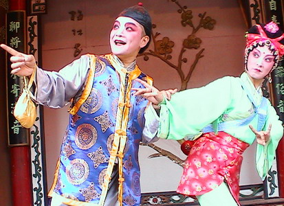 婺剧之服无水袖(过去),表演多见手上功(手指、手腕上下功夫);亮相、功架好看头,近似敦煌人物态;特技舞弄具一格,变脸、耍珠、十八吊。6月24日至26日很多人慕名来赏“断桥”,我也是其中之一。之前很少接触婺剧,有些担心戏文听起来吃力,但听后则感婺剧唱腔流畅大落,朗朗上口,并可随剧情进展,或激越高亢,或行云流水,或凄厉悲怆,或谈谐有趣。观之“蛇步蛇行”(白蛇青蛇的表演),台步轻捷细碎、S状前行,犹如蛇行水面,飘飘欲仙;观之《断桥相遇》,小青追赶许仙之刹,杀气腾腾,顿时停住,头抖三下(“三窜头”)好似水蛇觅食之态。除了《断桥》一折,《昆仑盗草》,《水漫金山》的武戏也倍受欢迎,引得观众掌声阵阵。