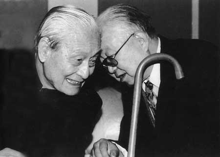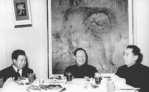 周恩来总理与赵朴初(中)在一起。柬埔寨西哈努克亲王在座。周恩来称赵朴初是国家的宝贝