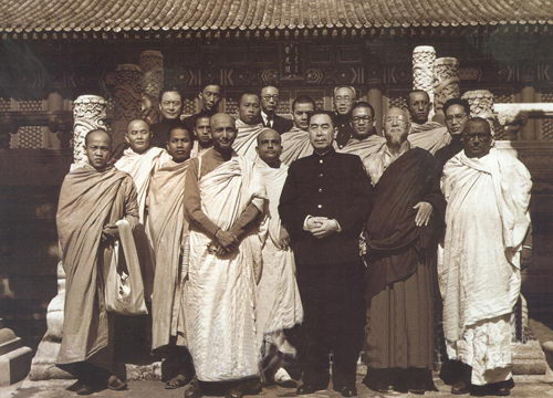 1956年10月,周恩来在中南海和国际佛教僧侣代表团合影。后排左一为中国佛教协会副会长赵朴初