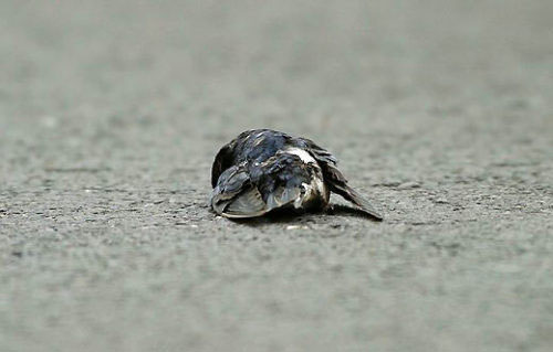 很多的家燕,成群停留在马路上觅食戏耍,看着来往的大货车,突然,一辆呼啸而过的大货车开过,地上只看到一团黑影留着,不幸又发生了……