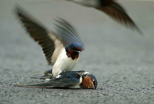 鸟儿的感情也是相当丰富的。尽管这只家燕已经在地上不会动了,但是,另一只仿佛是她的家人,马上飞到她的身旁,不忍相信这个实事……