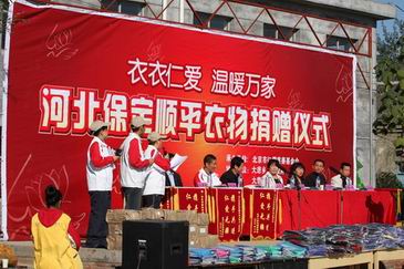 2008年10月26日上午,北京市仁爱慈善基金会在顺平县大悲乡的大悲中学举办了“衣衣仁爱 温暖万家”衣物捐赠活动。历经数月的衣物收集、分拣、打包以及一次次的实地调研和筹备,凝聚着数万人点滴爱心的十余万件衣物在这一天终于走入近6000家淳朴的农户,爱心洒满太行山脉的44个小山村。