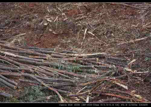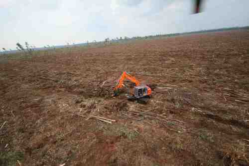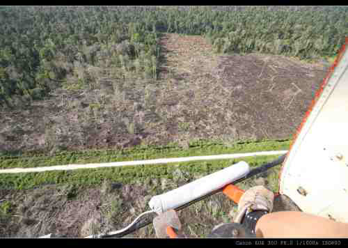 直升机向岛的纵深处飞行,接下来的景色让人触目惊心。大片大片生长了成百上千年的热带雨林被砍伐得一塌糊涂。大型的机械化作业,对雨林完全是灭绝式的采伐。砍过的地方,一片狼籍。这些砍伐者拿出一副斩草除根,不留活路的姿态。把伐过的大地又用挖掘机翻了个底朝天。一望无际的野地上四处都堆满了伐倒的树木。泥炭地被掘得四处开花。附近还没有被砍伐过的热带原始森林,郁郁葱葱,生机勃勃。有的大树高达几十米,远远地看下去真是壮观而美丽。但是凡是人类采伐过的地方,却全都像得了斑秃或者牛皮癣,雨林中居然还有一个烟雾弥漫,怪味熏天的一个什么加工厂,大白天烧着天燃气,在热带雨林中高耸着烟囱,火光冲天。