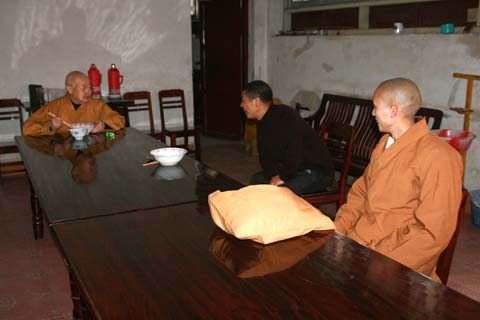 法师一句话也不多讲,只是认真地礼拜寺院的每个殿堂。之后,简单与大家打声招呼,法师提出要去挂单,便径直去了三溪寺的客堂。客堂里慧轩法师正在吃饭,贤满法师立刻下身顶礼。坐下后,法师问:“您今年高寿?”老法师答道:“71。”法师亲切地说:“跟我老父亲一个年龄!您看上去气色很好啊!”老法师听了,原本红润的脸上绽放了笑容。