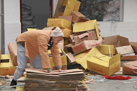 在衣物分拣现场,法师见到衣服分拣组的组长刘军,打开了他的“毛主席语录”:“干得很不错哦!劳动改造人,毛主席说的话真没错!”原来这位师姐半年以来一直坚持在几十万件的衣物堆里带着大家干,越干越踏实,越干越开心。接着,法师自己也开始默默地参与劳动,整理装鞋的箱子。看着法师瘦弱的身影在人群中忙碌,很多人也随之加入进来。因为鞋到得比较晚,大家要把3000多个已经初步包装入库的袋子取出来,装上解放鞋,再封口,入库。每个袋子都被衣物、药品和鞋子塞得满满的,有时因为东西太多而无法封口,只能分成两包。