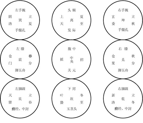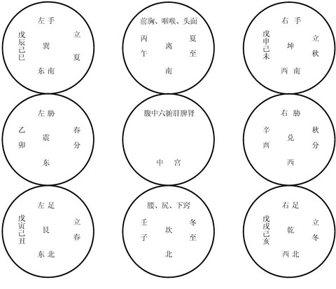 如果人体虚弱,又逢来自八方的虚邪贼风,正不胜邪,内外相因,就会患上肌弱、脉闭、身重等病症。如果人体中宫气血旺盛,所统摄八宫循环有序坚固护内,就能“正气存内,邪不可干”。《内经》论述人的身形和九野相应是:①左足,②左胁,③左手,④前胸、咽喉、头面,⑤右手,⑥右胁,⑦右足,⑧腰、尻、下窍,⑨六腑及肝、脾、肾膈下腹中(见图1)。《灸经图》布穴是:①左足,②左膝,③左手,④头额,⑤右手,⑥右膝,⑦右足,⑧下窍,⑨腹中(见图2) 。两者相比较,除左右胁换成左右膝,④、⑧、⑨仅取头额、下窍、腹中外其余皆相同。从《灸经图》治疗五劳七伤九宫八卦布穴图所示:腹中的关元位居中央之宫属招摇;坎卦属水,位居北方,应冬至、叶蛰,在人体下窍玉茎头穴处;艮卦属土,位居东北方,应立春、天留,在左脚踝痹经、中封穴处;震卦属木,位居东方,应春分、仓门,在左膝脚五舟穴处;巽卦属木,位居东南方,应立夏、阴洛,在左手腕手髓孔穴处;离卦属火,位居南方,应夏至、上天,在头额发际穴处;坤卦属土,位居西南方,应立秋、玄委,在右手腕手髓孔穴处;兑卦属金,位居西方,应秋分、仓果,在右膝脚五舟穴处;乾卦属金,位居西北方,应立冬、新洛,在右脚踝痹经、中封穴处。