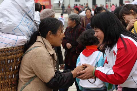 北京市仁爱基金会的志愿者们站在北川县擂鼓镇中心小学门口与这里的乡亲们依依惜别,看着乡亲们淳朴的笑脸,满满的背篓,我们的心中也释然了,终于让这份来自五湖四海的爱,伴着碧蓝的湔江水,在连绵不断的龙门山脉流淌……