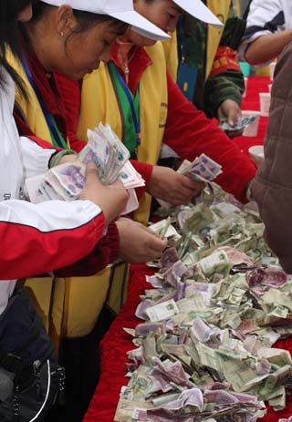 当志愿者们手托着乡亲们常背的竹篓,走向观众的时候,一双双手争先恐后地伸过来,来领大米和衣物的很多老人不仅捐出了一元硬币,还把身上的钱也掏出来,一角、两角、一元、两元、十元、二十元、一百元,雪片般飞进竹篓。大家的目光追随着盛满爱心的小竹篓,每一个人都被浓浓的真情所感染。在这里,地震和泥石流对这片热土的摧残比比皆是;在这里,倾家荡产、痛失亲人的伤痛深深地烙印在每个人的内心。此情此景,这些可亲可敬的羌族乡亲们和孩子们正在向世人展现着真情的力量与无私。