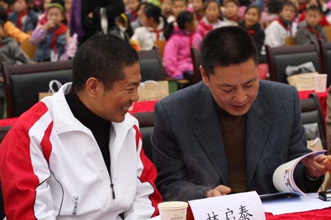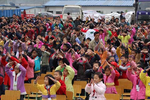 北川县委副书记李作虎、擂鼓镇书记韩忠明到会致辞,对仁爱基金会向灾区人民传递关爱的义举表示赞叹。林启泰秘书长代表无数的爱心捐赠者和所有仁爱志愿者向擂鼓镇的父老乡亲致以衷心的问候。此刻,或许千言万语都无法表达仁爱对灾区人民深深的敬意和祝福,林秘书长引吭高歌,为乡亲们清唱了一首振奋激昂的歌曲——《重新再来》。饱含肺腑真情的嘹亮歌声打动了在场的所有人,泪光在乡亲们眼中闪烁,一颗颗澎湃的心汇聚在一起,人们情不自禁地加入进来,歌声回荡在伤痕累累的青山绿水间,回荡在蕴含希望的板房校舍上空,更回荡在每一个人的内心深处,共同演奏一首坚强的心灵之歌!