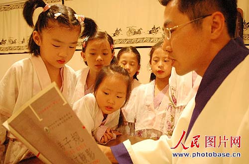 祁悦把6岁的女儿送进苏州的某间私塾,据说在那里所有师生都身着统一汉服,上课前必须向孔子像鞠躬,然后这些娃娃就开始摇头晃脑,抑扬顿挫地诵读《弟子规》、《论语》等深奥难懂的“大古书”。说到送孩子去私塾的原因,祁悦深有感叹:“中国5000年的传统文化,应该让孩子从小就开始接触,肯定对孩子一生都有好处。比如《三字经》里那些为人处世的道理,他们也许现在还不大理解,但长大后受益匪浅。”