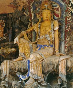 宋代是麦积山石窟艺术发展最后一个极盛期,虽然当时天水处于宋金交战前沿,战火烽起,但佛事活动并未停滞,北宋尚在麦积山瑞应寺出了一位云门宗第五祖圆通禅师秀铁壁,这一时期,达官贵人往游题刻不断,留下许多歌咏麦积山诗文。宋代麦积山造像艺术更加重视写实性与世俗化,并且出现了前代没有的艺术形象,如水月观音(58窟)白衣观音(165窟)邈真僧像(50窟)使麦积山石窟的佛教艺术内容大为增加。此期窟的释迦瑞像衣饰处理表现极强质感,造型传神,充满无相无住的大关怀,艺术表现手法超越前朝,自成一格。窟供养人生动传神,表情自然,为同期宋塑中的艺术珍品。4、43等窟的金刚力士、造型夸张,威猛刚毅中又有戏剧化的夸张处理手法无论对于解剖的精熟,或是气度的把握都对后世造像产生了标准化的影响。43、165、58等窟的菩萨造像温婉可亲,神态祥和,衣饰华美,装饰繁复。