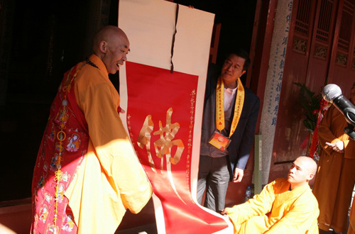 参加完了开幕式,举行了祭祖仪式,由国家宗教局徐远杰司长、净良长老、明学长老、师父等人共同为雪峰寺特地为雪峰义存禅师而制作的塑像揭幕,全体人员一起参加了上大供仪式,就结束了上午的活动。