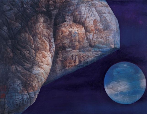 雪域高原,一个清澈的精神家园,人们认为秃鹫是连接天地的灵物,可使灵魂在苍穹、高地、雪峰间自由翱翔。尼玛泽仁的《天地间》以粗犷的构图,大胆生动的色彩再现了西域独有的葬礼习俗。《魂兮归去》以对比强烈为构图中心,把人们对天国的向往表现得淋漓尽致。《极地梦想》里,画家以冷峻的色调,夸张的构思,展现了宇宙空间里日月山川岩石的广袤荒远;新作《离太阳最近的地方》中,红土地上,强烈的高原日照使大地仿佛停止了生命,唯有黝黑的人们在顽强地劳作,只有飞扬的尘土,坚硬的石块陪伴他们。有着漫长岩画历史的藏民族,同样有着岩石坚韧昂扬的精神。